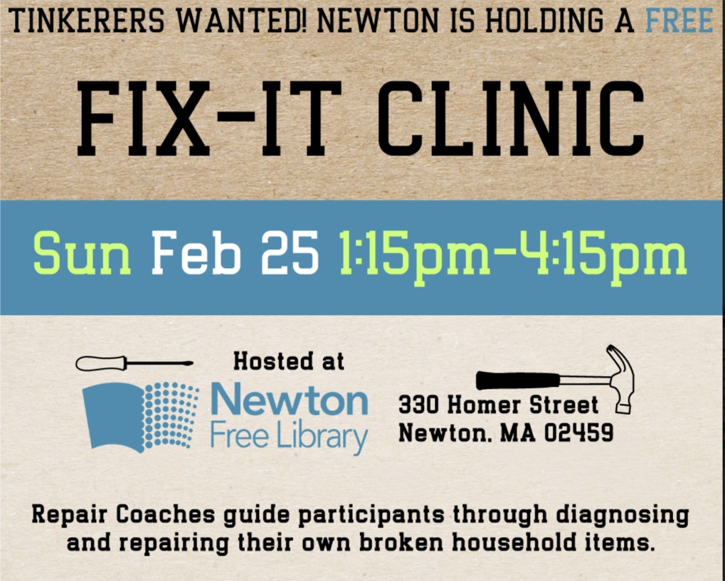 The next Newton Fix-It Clinic will be on Sunday, February 25, 1:15-4:15PM at the Newton Free Library (330 Homer Street). It’s free! Sign up to get help repairing an item, or sign up to be a coach. We still need a coach for jewelry repair. If you have a different…
