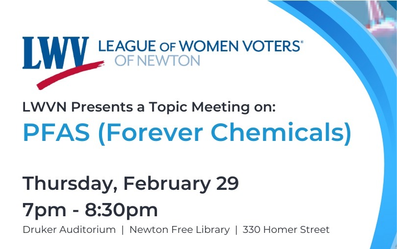 On Thursday, February 29, the League of Women Voters of Newton – together with its cosponsors Better Action Now on Artificial Turf in Newton, Green Newton, and Mothers Out Front Newton – will hold a Topic Meeting on per- and polyfluoroalkyl substances (PFAS), a group of man-made chemical compounds known as…