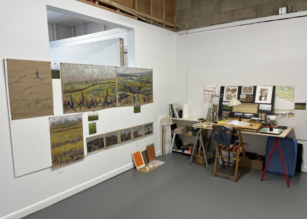 The walls around the individual artist spaces give privacy but are low enough to allow colleagues to interact and offer supportive feedback to each other on their visions.