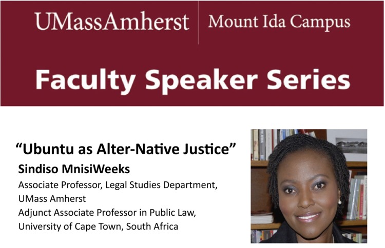 On February 29, 5:30PM-7PM, Dr. Sindiso MnisiWeeks will speak about “Ubuntu as Alter-Native Justice” at Shaw Hall on the UMass Amherst Mount Ida Campus in Newton, as part of the university’s faculty speaker series. The event is free and open to the public. RSVP by calling 617-243-1119 or emailing [email protected].