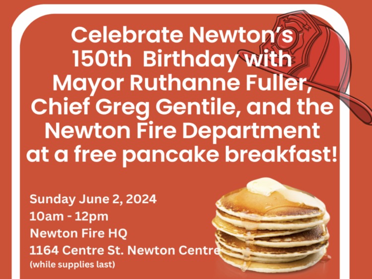 The City of Newton was incorporated 150 years ago, and as part of a year-long celebration, the City will host a Free Pancake Breakfast on June 2, 10AM-Noon at Newton Fire Department Headquarters (1164 Centre Street, Newton Centre). Free pancakes while supplies last. Climb a firetruck. Take a selfie with Paw Patrol. Test your skills at controlling a fire hose.