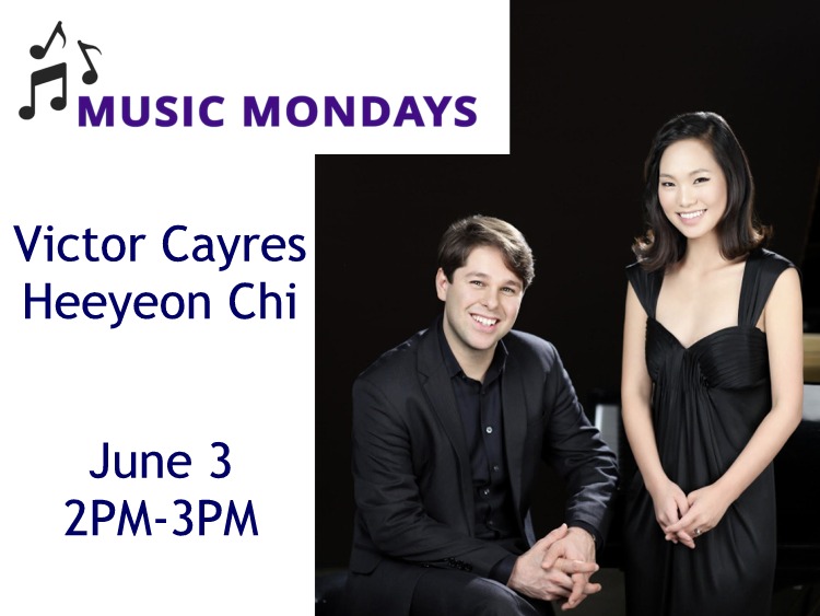 Music Mondays will offer a concert on Monday, June 3, 2PM-3PM — both in-person at the Scandinavian Center (206 Waltham Street, West Newton) and live streamed via Zoom. The concert will feature piano masterworks by Faure, Barber, and Debussy performed by husband and wife piano duo and award winning pianists Victor Cayres and Heeyeon Chi.