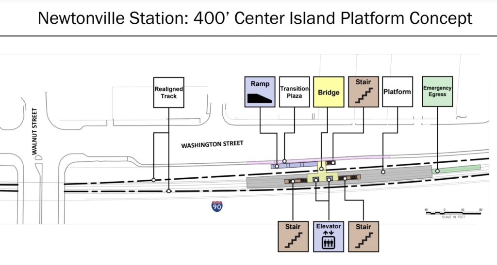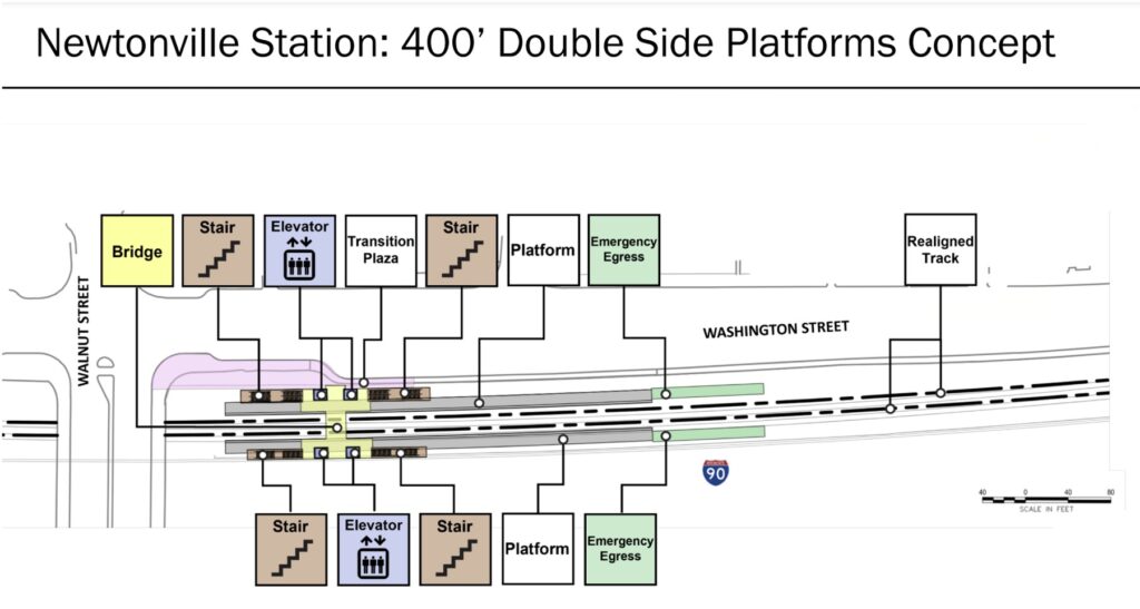 For safety and to reduce the need to modify the Walnut Street bridge, the station entrance would be moved off that bridge to Washington Street between Central Avenue and Beach Street. The platform length would be reduced from 800 to 400 feet to save money. The MBTA said only local trains no longer than 400 feet would stop at the Newtonville station.