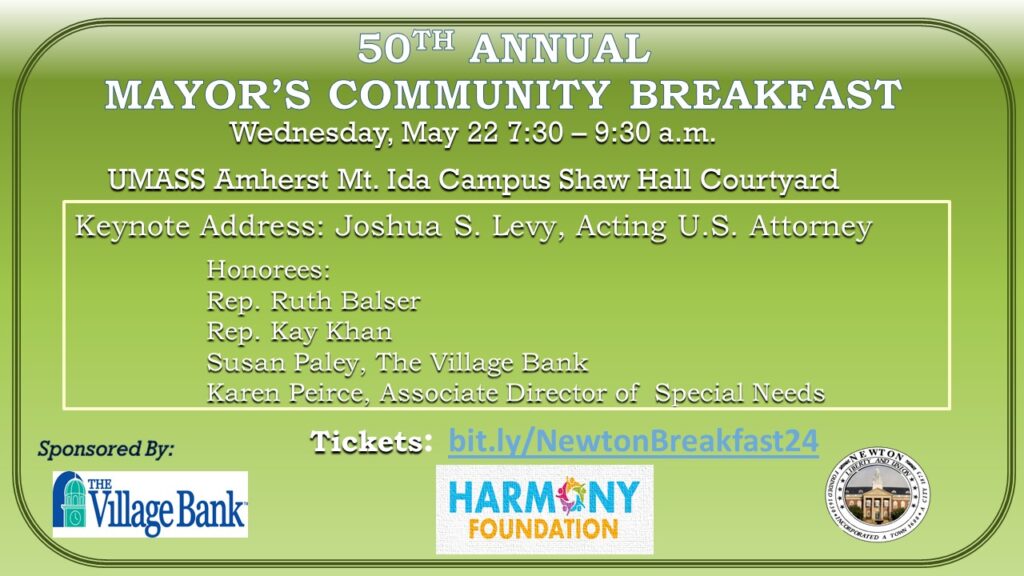 The 50th annual Mayor’s Community Breakfast will be held on May 22, 7:30AM-9:30AM, on the UMass Amherst Mt. Ida Campus, in the Shaw Hall Courtyard (map). The event is hosted annually by the Harmony Foundation and sponsored by The Village Bank. Tickets are $40. The keynote speaker will be Joshua…