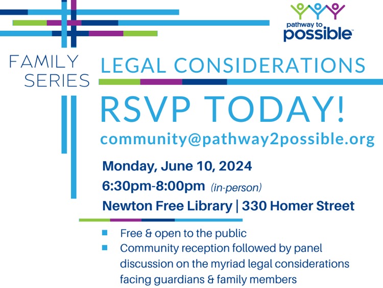 Pathway to Possible will host a Family Series panel discussion on Legal Considerations on Monday, June 10 at 6:30PM at the Newton Free Library (330 Homer Street). A panel of legal experts will help families learn more about the myriad considerations that go into setting up and safeguarding the care of a loved one with a developmental disability, while fostering an opportunity for peer support and engagement. It’s free and open to the public; RSVP or submit questions for panelists ahead of time by emailing [email protected].