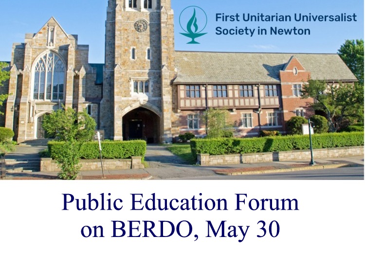 A coalition of Newton climate groups* will present a free public education forum on BERDO (Building Emission Reduction and Disclosure Ordinance). It will be held on May 30, 6:30PM-8:30PM in the Parish Hall of the First Unitarian Society in Newton (1326 Washington Street, West Newton). Light refreshments will be provided by Green Newton. Register here.