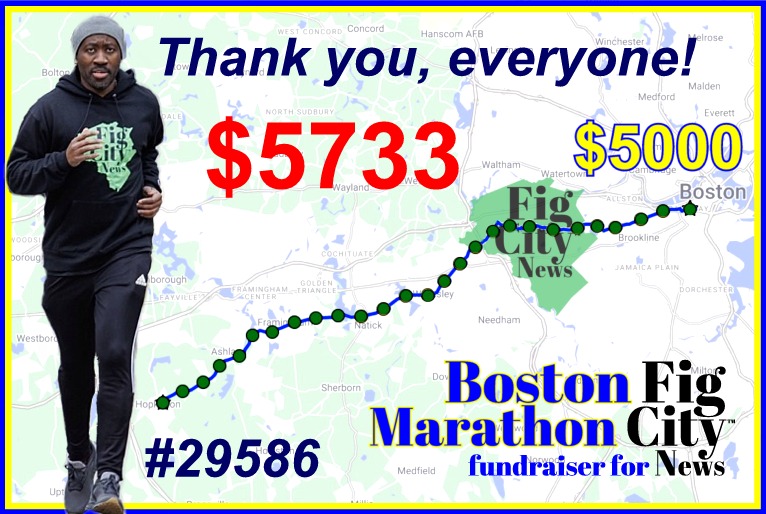On April 15, Fig City News board member Tamirirashe Gambiza ran the 128th Boston Marathon to raise funds for Fig City News with a goal to raise $5,000 to expand FCN’s payments to local reporters and student interns. He raised $5,733 — and he thanks all 64 donors who are helping to bring the news to Newton.