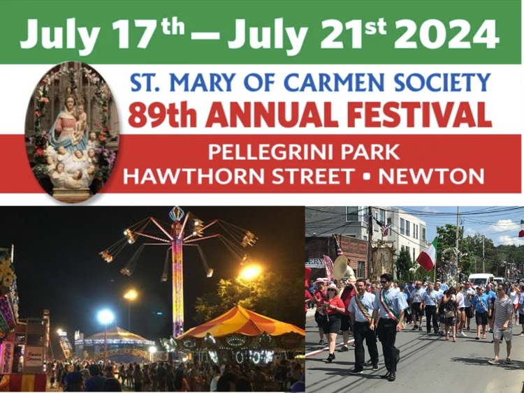 The St. Mary of Carmen Society will host its 89th annual Italian-American festival, July 17-21, 5PM-11PM (4PM-11PM on July 21) in Pelligrini Park (11 Hawthorn Street, Nonantum). Carnival has special prices for rides on Wednesday and Thursday. Food, beer, and wine for sale each night. Raffles supporting the St. Mary…