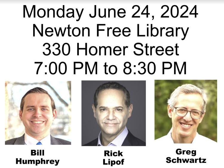 The Democratic Committees in the 12th Middlesex State Representative District will host a candidate debate on June 24, 7PM-8:30PM, at the Newton Free Library (330 Homer Street). Democratic candidates aiming to succeed Rep. Ruth Balser in representing that district — Bill Humphrey, Rick Lipof, and Greg Schwartz — will participate.