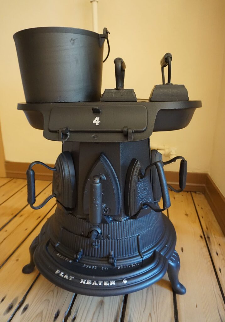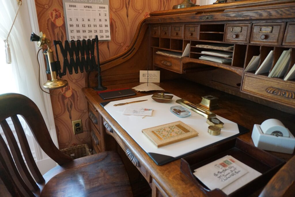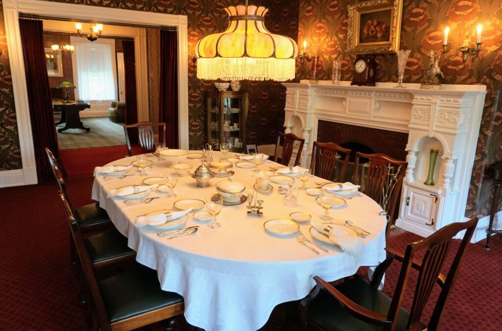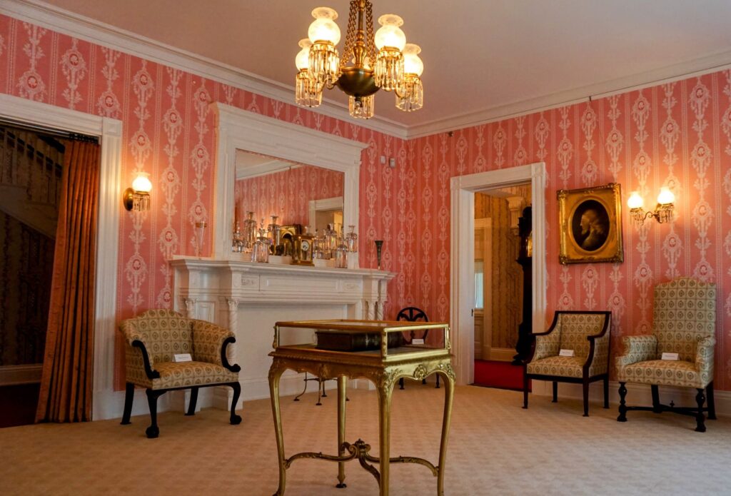 The mansion, originally built in the 1880s, has been fully renovated to recreate the time period Mary Baker Eddy lived in it, from 1908 to 1910. Original furniture has been reupholstered, metallic art deco wallpaper recreated, wool strips of loom carpeting sewn together and relayed on the floors, and the whatnot, epergne, and circular Hammond typewriter placed in their original locations.