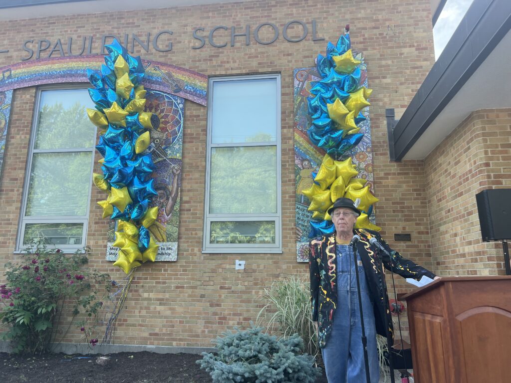 The Mosiac Mural Project for Spaulding was created over many months by Mr. Fichter, student participants, and community volunteers coordinated by Spaulding art teacher Alexandra Etscovitz. Ms. Etscovitz is a Spaulding graduate and has taught art at the school for over 20 years. Her passion and loyalty to the community was palpable during the event, culminating in a heartfelt speech during the unveiling ceremony with theme “in these walls.” She said, “It is you, the children for the past, and the present, and the future of Memorial-Spaulding that we celebrate today and every day in these walls. So finally these walls can do what I care most about: The walls can make everyone who walks by have a little glimpse into the most the hopeful and joyful part my world — the world’s best gifts, the children.”
