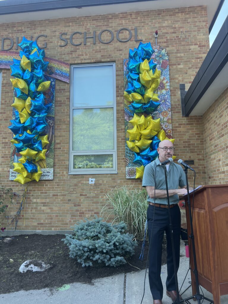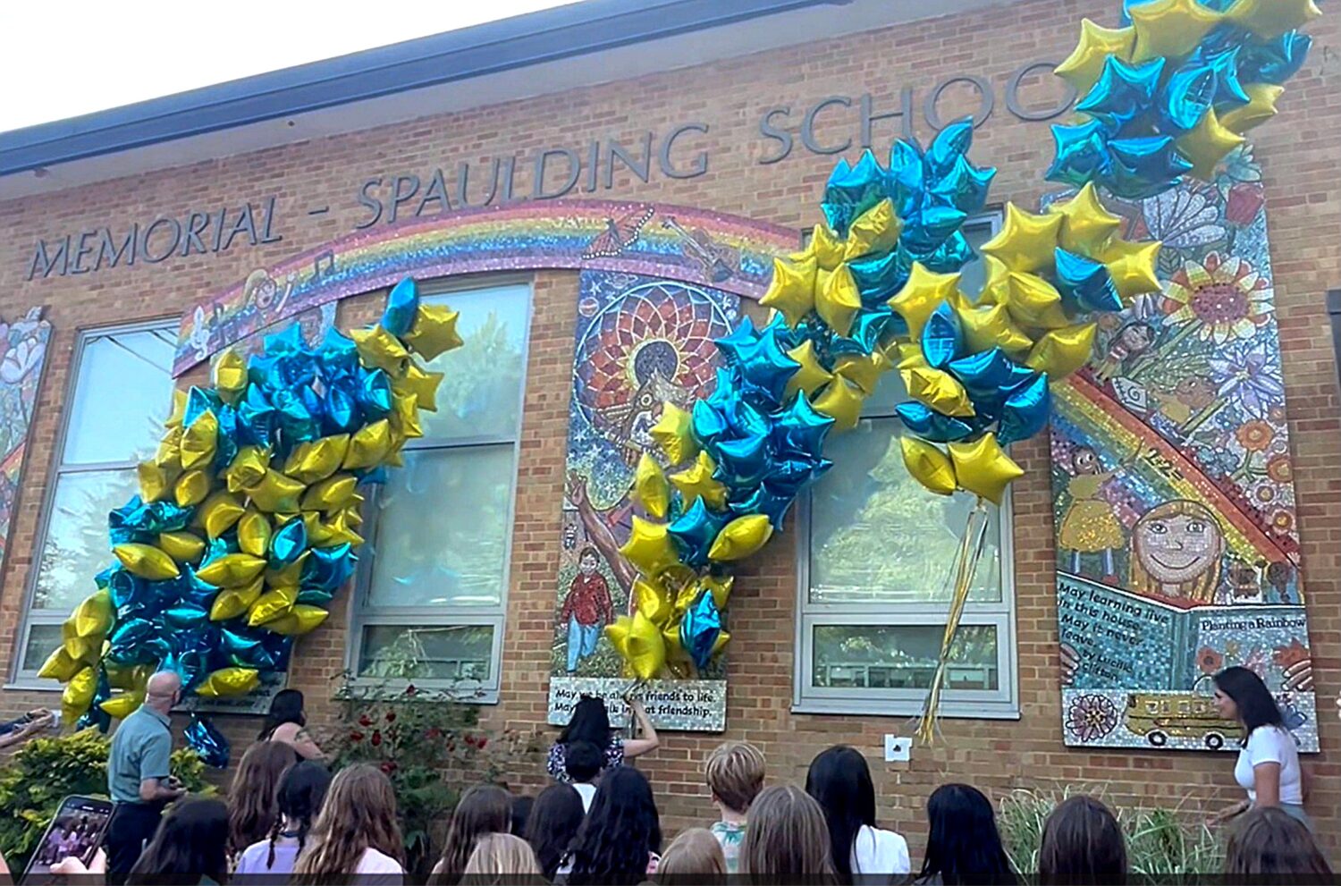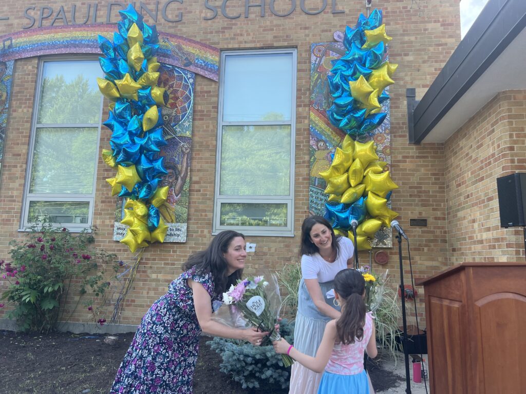 Jessica Poltarak and Kristen Pontoriero, former Spaulding PTO Presidents and current parents, co-chaired the Mosaic Mural Project and its fundraising. During her comments while both chairs were at the podium, Ms. Poltarak said, “The Mosaic Mural Project was a true labor of love, born out of a need to reunite our community post-Covid, and to beautify our school. Never before have I seen something so magnificent come from the work of hundreds of people — Kindergartners and their grandparents and everyone in between.”