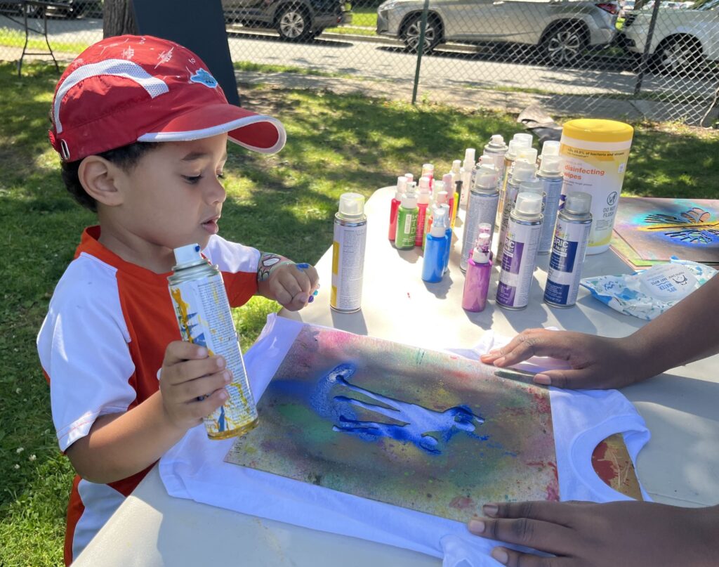 Using spray paint, 4-year-old Henry Jay Gathers concentrated on decorating his T-shirt with a stencil as his mom looked on.