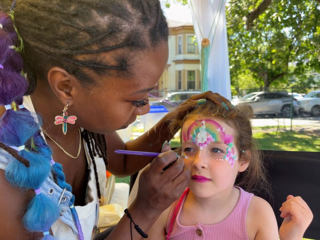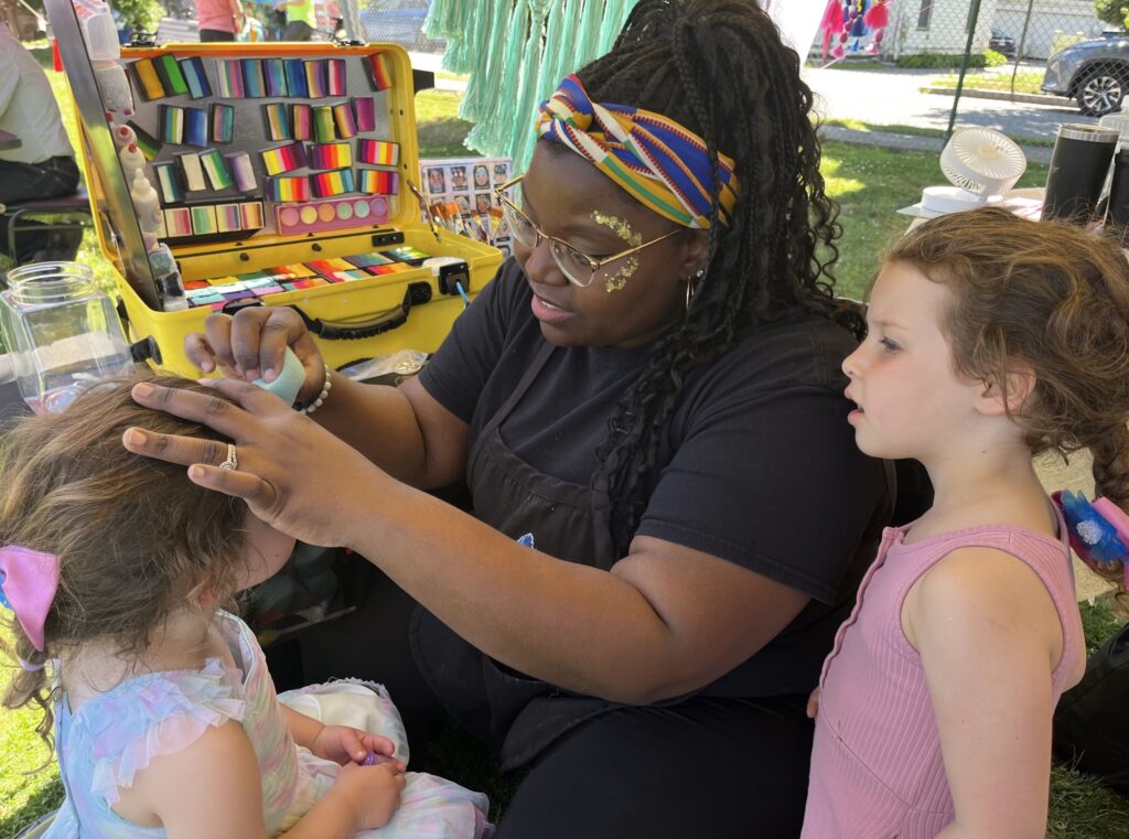 Nearby, 5½-year-old Lily and her 3½-year-old sister Zoe Micley, daughters of City Councilor David Micley, loved having their faces painted as unicorns at the Painting as Art & Ritual booth.