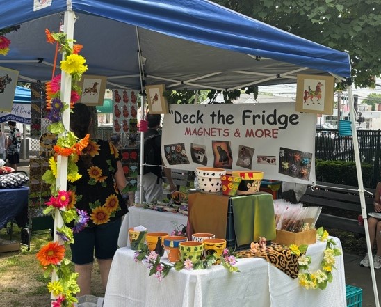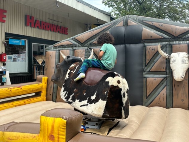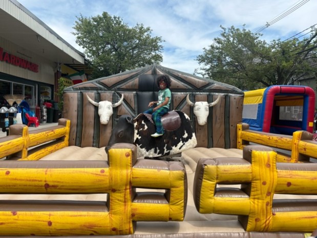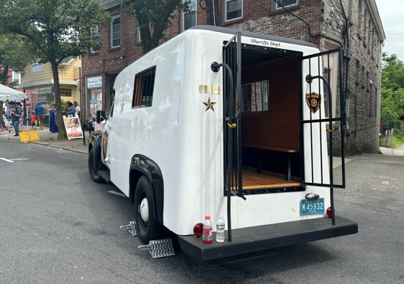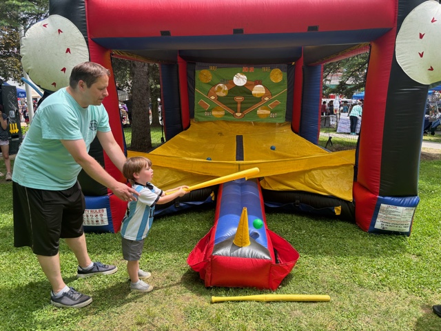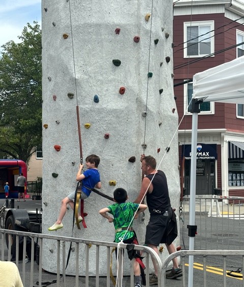 A large Newton Fire engine offered tours to scores of children and their parents (and grandparents). Sheriff Peter Koutoujian sent a Middlesex County Sheriff’s paddy wagon and officers for similar exploration opportunities. St. Mary of Carmen Society contributed the popular climbing wall. There was an inflated baseball batting practice installation, and for the most intrepid, a (mechanical) bronco bull-riding option. Davey the Clown wandered around, at times riding his unicycle or walking around juggling. For the younger audience, Rosalita’s puppets performed at the Ciociaro Club. Wandering around the park, people found an array of vendors of jewelry, magnets, stuffed animals and other goods, as well as information tables for Newton Community Education, Village Bank, and others.