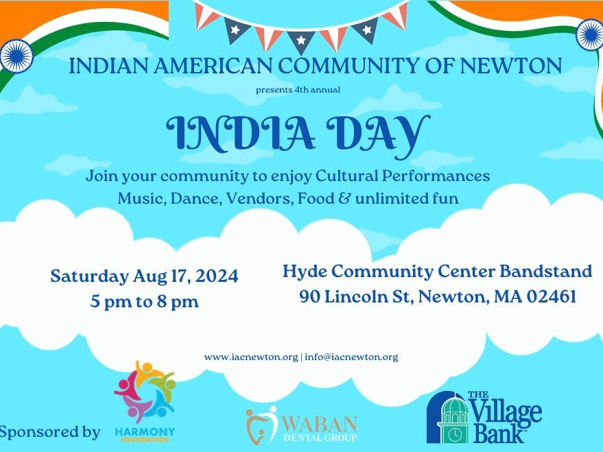Newton’s India Day will be celebrated with food, performances, music, games, and other activities organized by the Indian American Community of Newton. It will take place at Hyde Community Center Bandstand (90 Lincoln Street, Newton Highlands) on August 17, 5PM-8PM. For more info, contact [email protected].