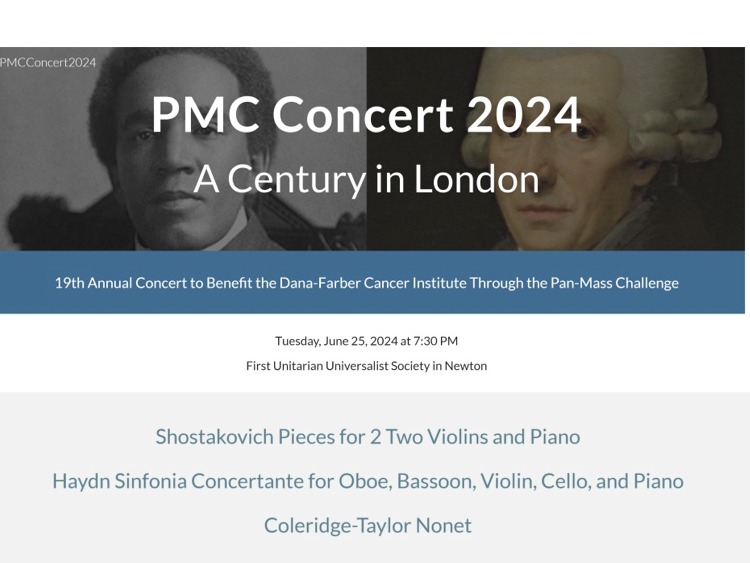 Joel Bard and Sayuri Miyamoto and friends will present PMC Concert 2024: A Century in London on Tuesday, June 25, at 7:30PM at the First Unitarian Universalist Society in Newton (FUUSN, 1326 Washington Street, West Newton). This will be their 19th annual chamber music concert to raise money for the Dana-Farber Cancer Institute through the Pan-Mass Challenge.