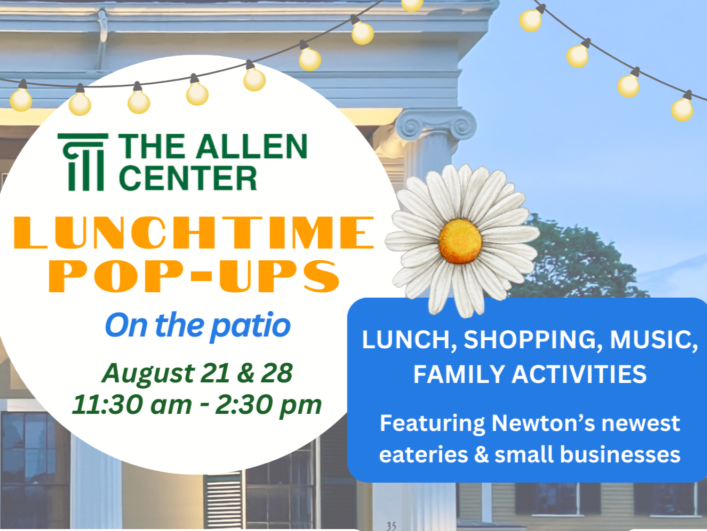 The Allen Center is presenting Lunchtime Pop-Ups on the Patio with exclusive lunch options, children’s art activities, and market shopping. The vendors will be a variety of women-owned businesses, neighboring retail shops, and other local sellers. It will take place on Wednesdays, August 21 and 28, 11:30AM-2:30PM at The Allen Center (35 Webster Street, West Newton).