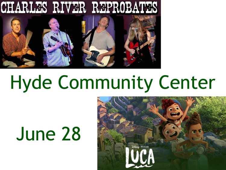 As part of Summer 2024 in the Highlands!, the Hyde Community Center (90 Lincoln Street, Newton Highlands) will host a concert (Charles River Reprobates) on June 28 at 6PM-8PM, followed by a movie (Luca) at dusk. All free, thanks to The Village Bank. Outside if the weather’s good, otherwise indoors.