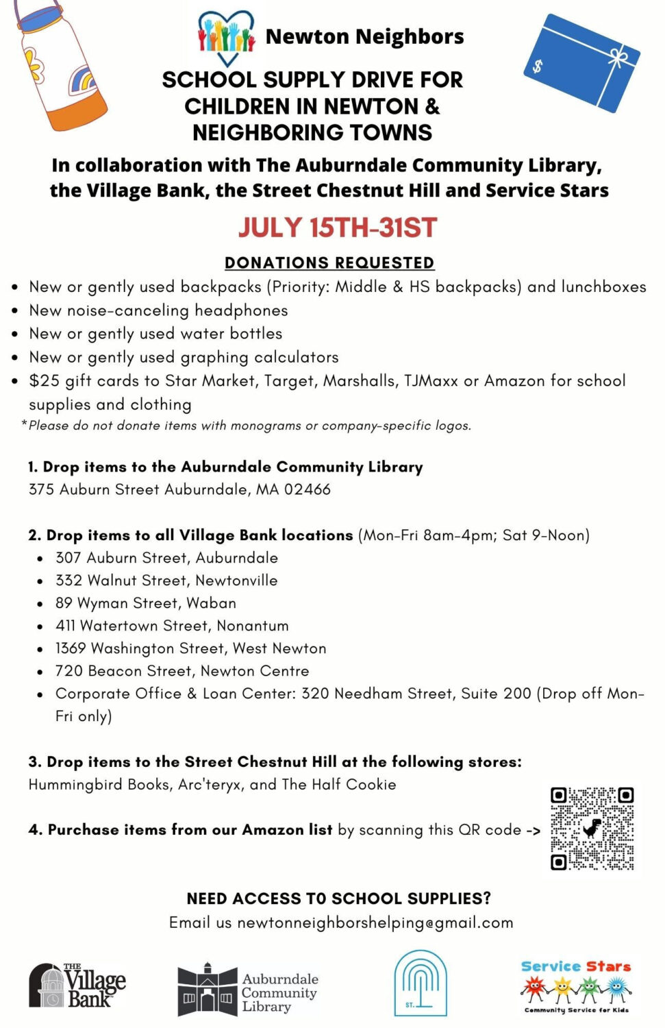 - $25 gift cards to Star Market, Target, Marshalls, TJ Maxx, or Amazon for the purchase of school supplies and clothing