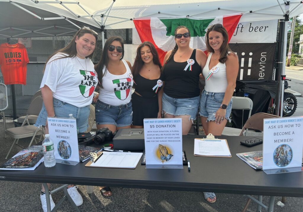 At the entrance to Pellegrini Park, a booth introduces the year-old reconstituted St. Mary of Carmen Women’s Society, featuring some of its members — most in their twenties, and most from the “next” generation of Nonantum’s Italian-American community. Two of its leaders — Arrianna and Maria Proia, both fourth-generation St. Mary of Carmen Society members — are greeting friends and answering questions, signing up interested women, and taking pictures. Their father, Charles (Chuck) Proia, is the Festival Chairman. His grandmother was the last President of the St. Mary of Carmen Women’s Society, which was inactive until Arianna and Maria revived it last year.