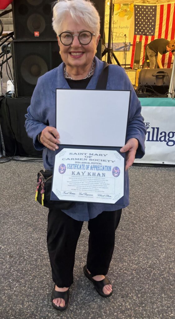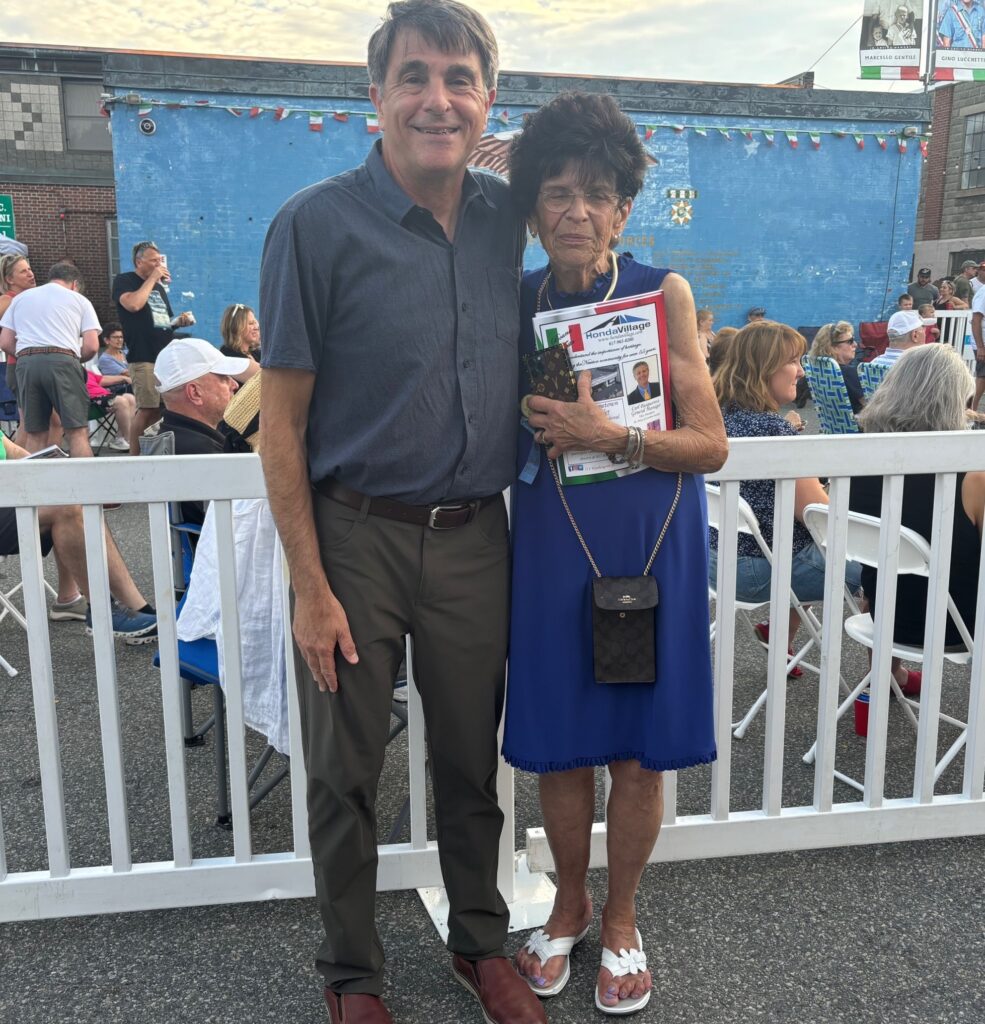 City Council President Marc Laredo joined the festivities on Thursday evening, bringing greetings to the enthusiastic crowd. Mayor Ruthanne Fuller, who always attends the Festival, this year accompanied by her son Chris, hugged, kissed, and shook hands with many of the attendees. On Saturday night, the Society honored retiring State Representative Kay Khan. (Her colleague, State Representative Ruth Balser, who is also retiring and was also to be honored, developed Covid that morning and could not attend.) Middlesex District Attorney Marian Ryan always marches on Sunday night in the procession returning the statue of the Madonna from her specially constructed shrine in Pellegrini Park to Our Lady Help of Christians Church. All five days are a blend of civic and social community engagement.
