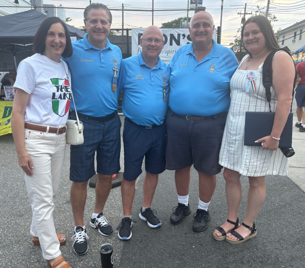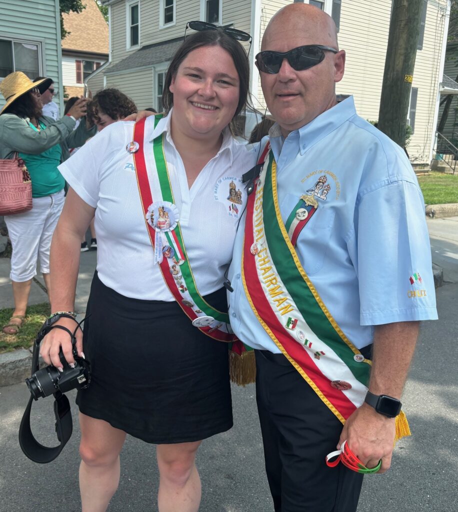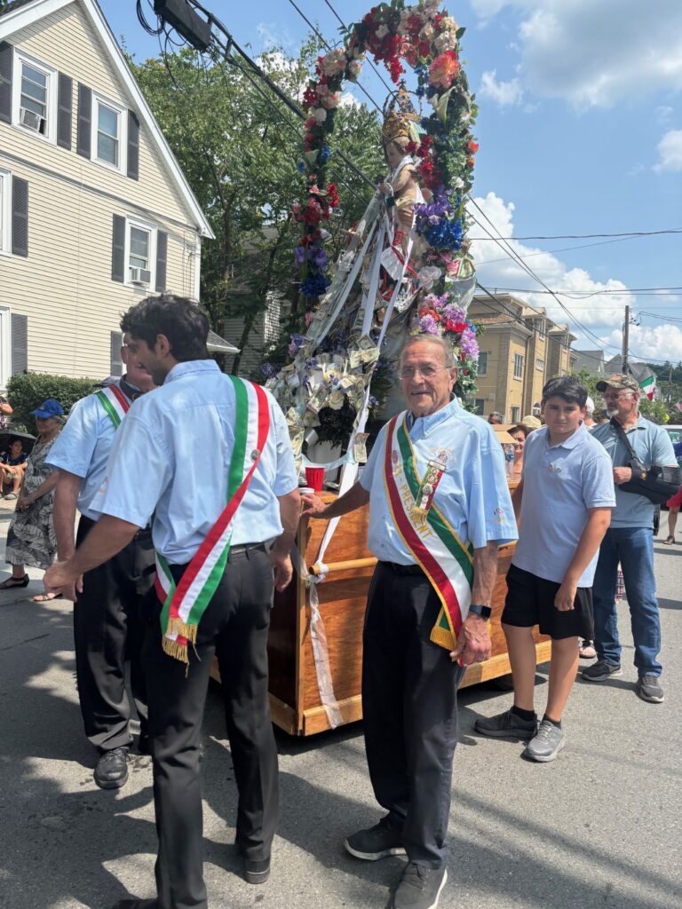 Society President Frank Battista and Vice President Carl Pasquarosa are on hand, serving as MCs, official greeters, and representatives of the Society’s enduring family tradition. This is the 89th year of the St. Mary of Carmen Festival — for many years called Festa — a four-generation salute to the many families who came to Nonantum from the village of San Donato Val di Comino in Italy.