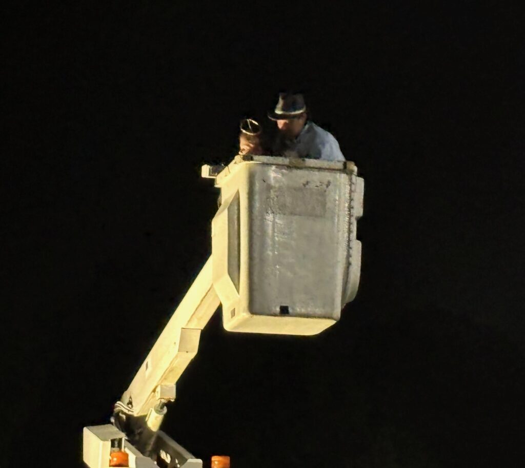 When the Madonna reaches the parking lot behind Our Lady’s, the procession halts, and ten minutes of eye-popping fireworks fill Adams Street with a rainbow of lights as well as clouds of smoke and intense noise. An appreciative crowd applauds and shouts. At last the display concludes, and the procession continues to Washington Street and through the church gates, where several hundred people are gathered for the final display of the night. Slowly, the Madonna rolls toward the church steps, as the eyes of the crowd turn toward a large cherry picker on the right-hand side of the church entrance. Slowly, the bucket of the cherry picker advances to meet the oncoming statue. And then a small figure — Emma Koffman — appears over the rim of the bucket, held up by her uncle, Joseph Caruso, a Men’s Society member. She is the daughter of Women’s Society member Loredana Koffman. Stationed just above the statue, she strews rose petals as the band plays and clouds of red, white, and green confetti fill the air, covering every surface. Fireworks explode as people cheer, applaud, and ascend the stairs to fill the church for the last service.