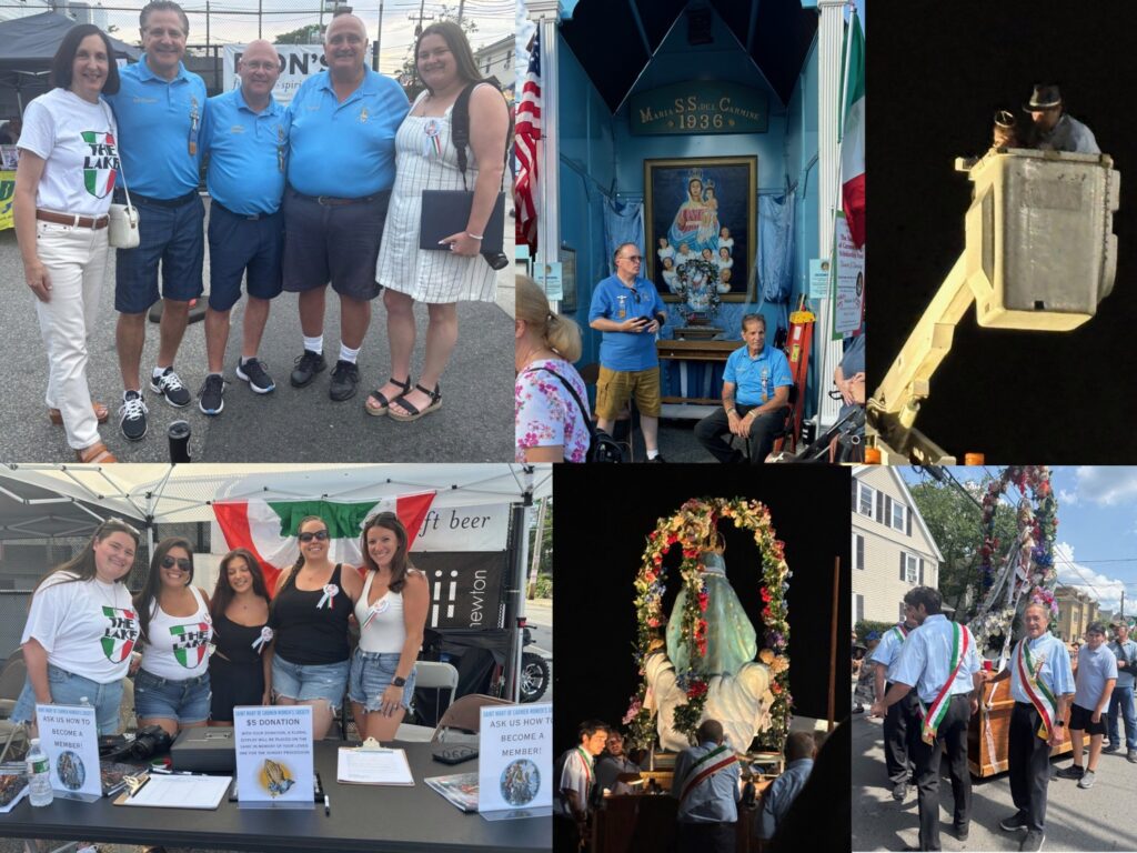 Red, white, and green flags; porch lights and median strips; flagpole posters with pictures of local business owners and departed members of the St. Mary of Carmen Society — and temporary electronic police signs warning drivers to expect delays July 17-21 from 4PM to 11PM — announce Nonantum’s annual Italian-American…