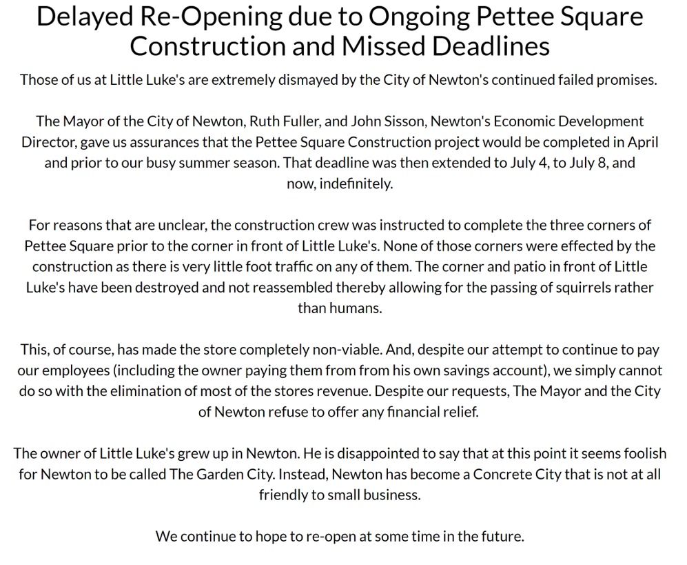 Philip Emmanuel, the owner of one Pettee Square business, Little Luke’s Cafe on the southeast corner of Pettee Square, told Fig City News that he has experienced disruptions in business due to the construction and has kept this business closed since June 30. He said in a public statement on the cafe’s website that because “the corner and patio in front of Little Luke’s have been destroyed and not reassembled,” making “the store completely nonviable,” he closed the cafe, laid off his employees, and continues to “hope to reopen in the future.”