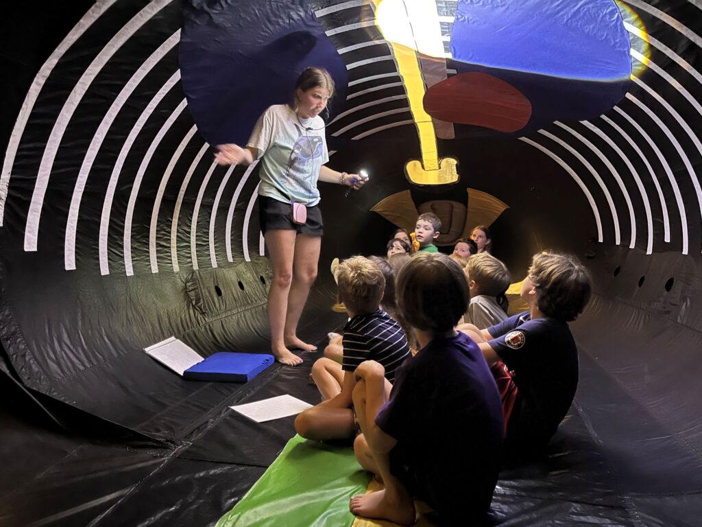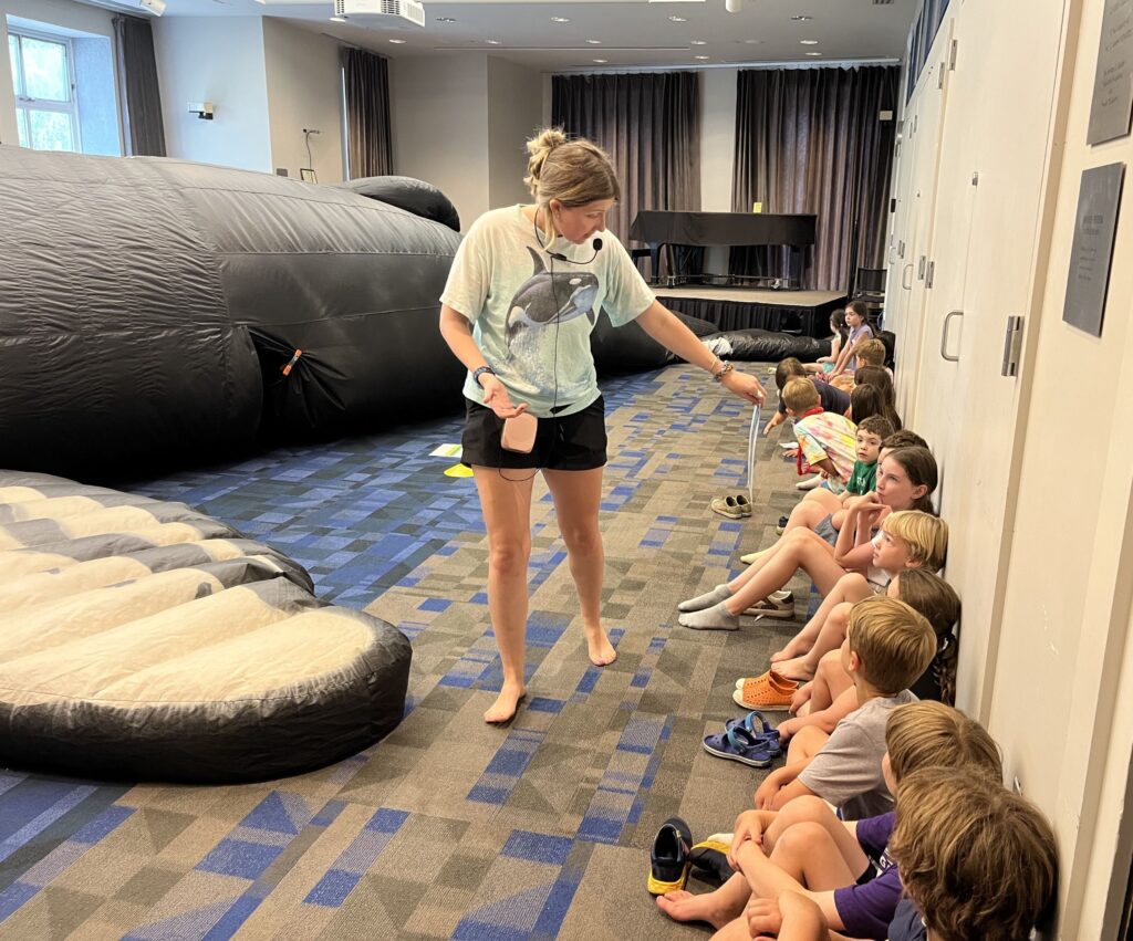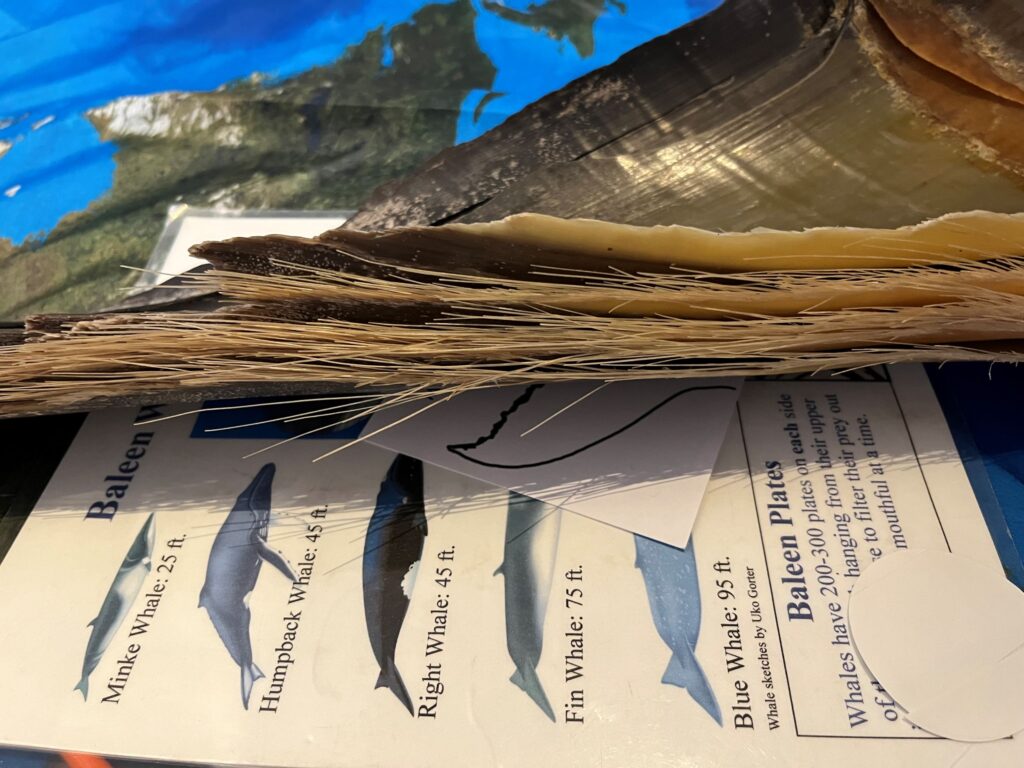 As they sat inside the dark interior, Tremblay let kids see and touch real whale bones, teeth and baleen, which Nile has. According to Whale & Dolphin Conservation USA, “baleen plates filter, sift, sieve or trap the whales’ favorite prey from seawater inside their mouths.”
