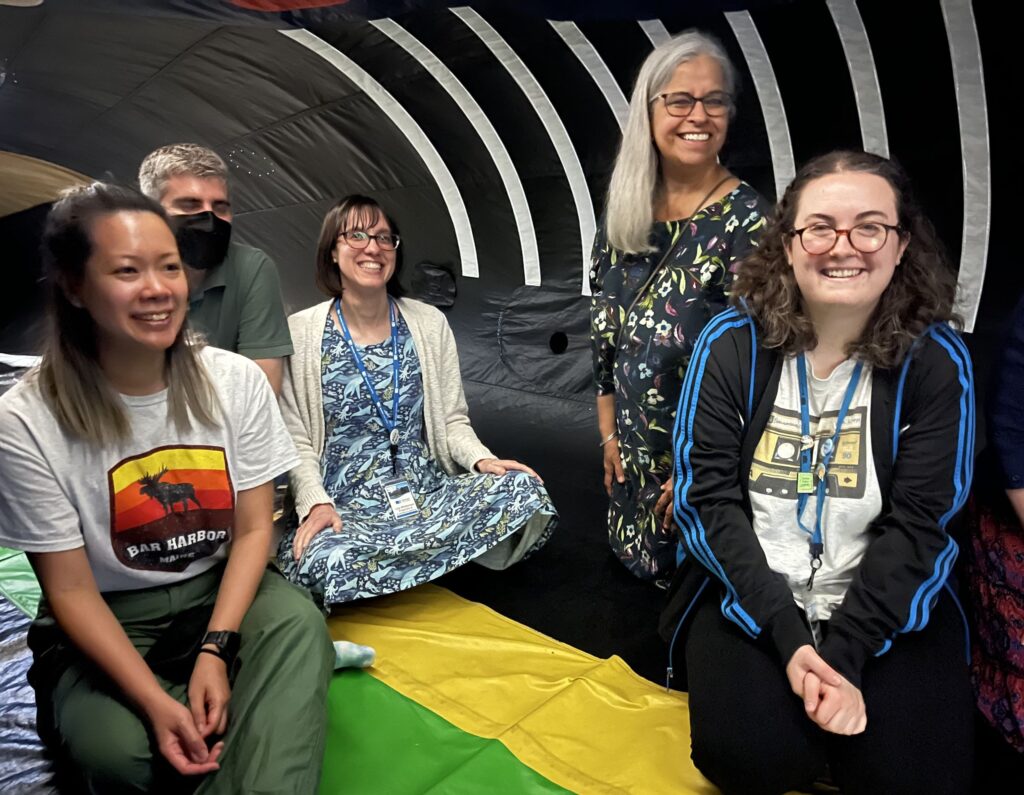 Holding a flashlight, Tremblay pointed out the heart, ribs, stomachs (humpbacks have three) and other body parts to the children sitting cross-legged inside the body. Several kids shared their experiences of going on whale-watching trips and seeing water spray as the animals breathed through their blowholes. Tremblay then pointed out the corresponding spot inside the model where the blowhole would be.