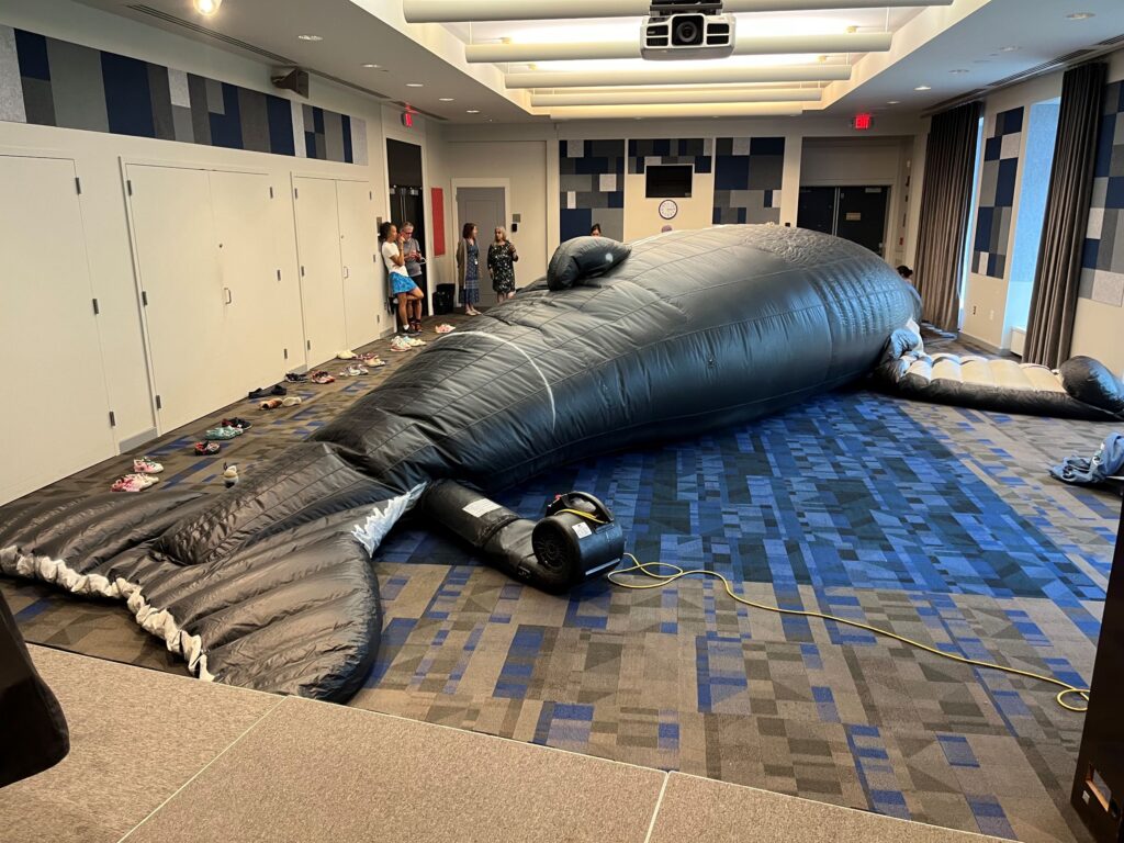 The impressive and realistic-looking creature ran the length of the library’s Druker Auditorium, amazing kids as soon as they walked in the door. Although the Whalemobile is 43 feet long, adult female humpbacks can grow up to 49 feet long, according to the Alaska Department of Fish and Game.
