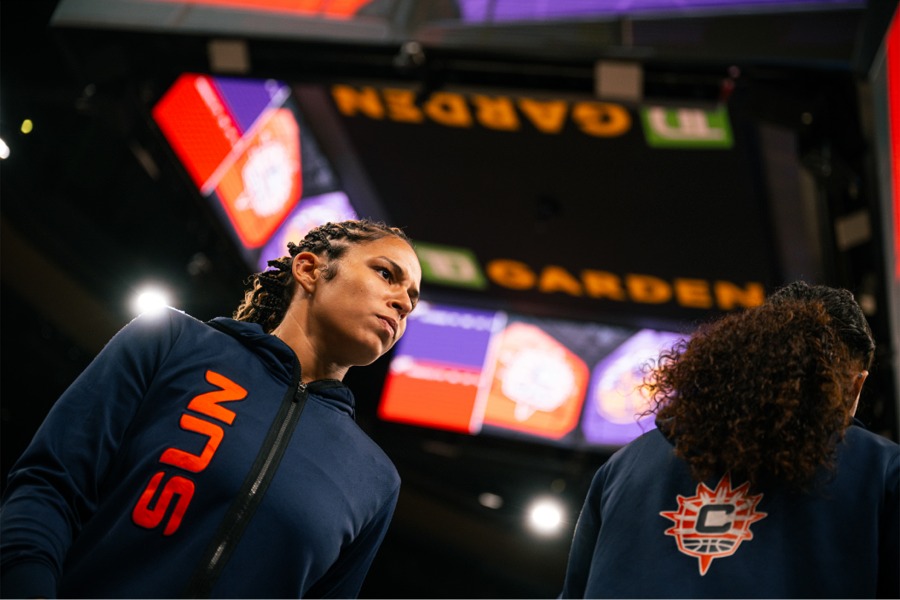 Nearly two hours before tip, long before a sea of Connecticut Sun orange flooded the arena, Burton sat side-by-side with Kayla, sharing smiles and conversation in an otherwise quiet setting. Shortly after, music blared through the speakers — showtime. Warmup routine. Pregame interview. Sign a few autographs, then gametime.