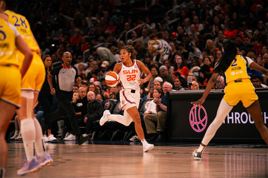 Newton's Veronica Burton with Connecticut Sun in first WNBA game in TD Garden, vs. Los Angeles Sparks, Aug. 20, 2024 (Photo by Meghan Murphy/Connecticut Sun)