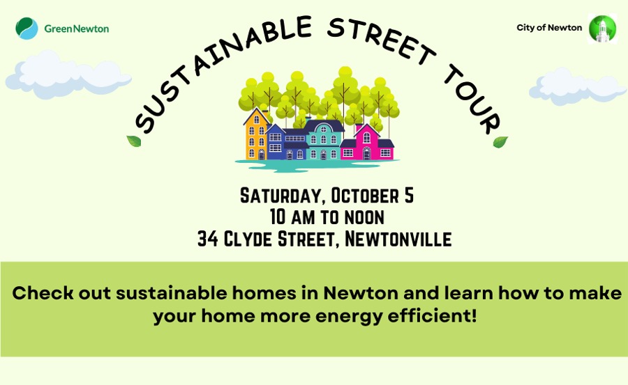 Green Newton has organized yet another Sustainable Street Tour — this one on Clyde Street in Newtonville on October 5, 10AM-Noon — where attendees can talk with Newton homeowners who have made their homes more energy efficient with heat pumps, solar panels, and EV chargers. Clyde Street is across Walnut…