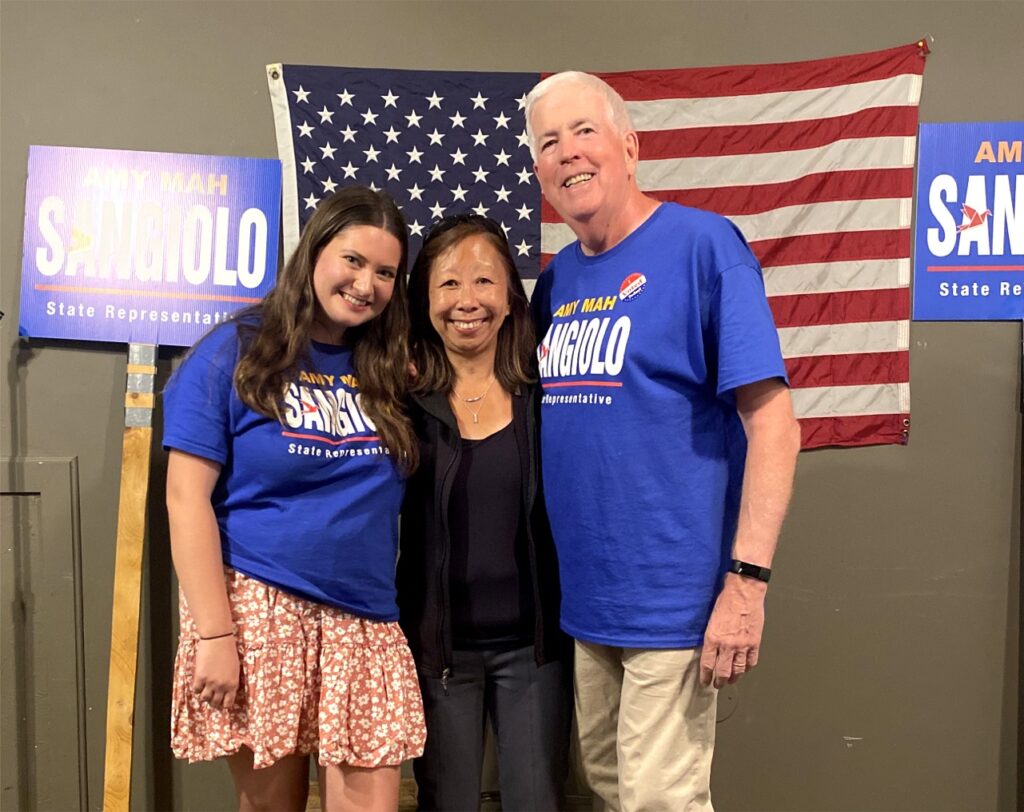 Celebrating victory in 11th Middlesex District: Deputy campaign chair Natalie Moran, Primary winner Amy Sangiolo, and Campaign chair Jay Harney