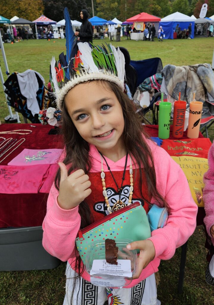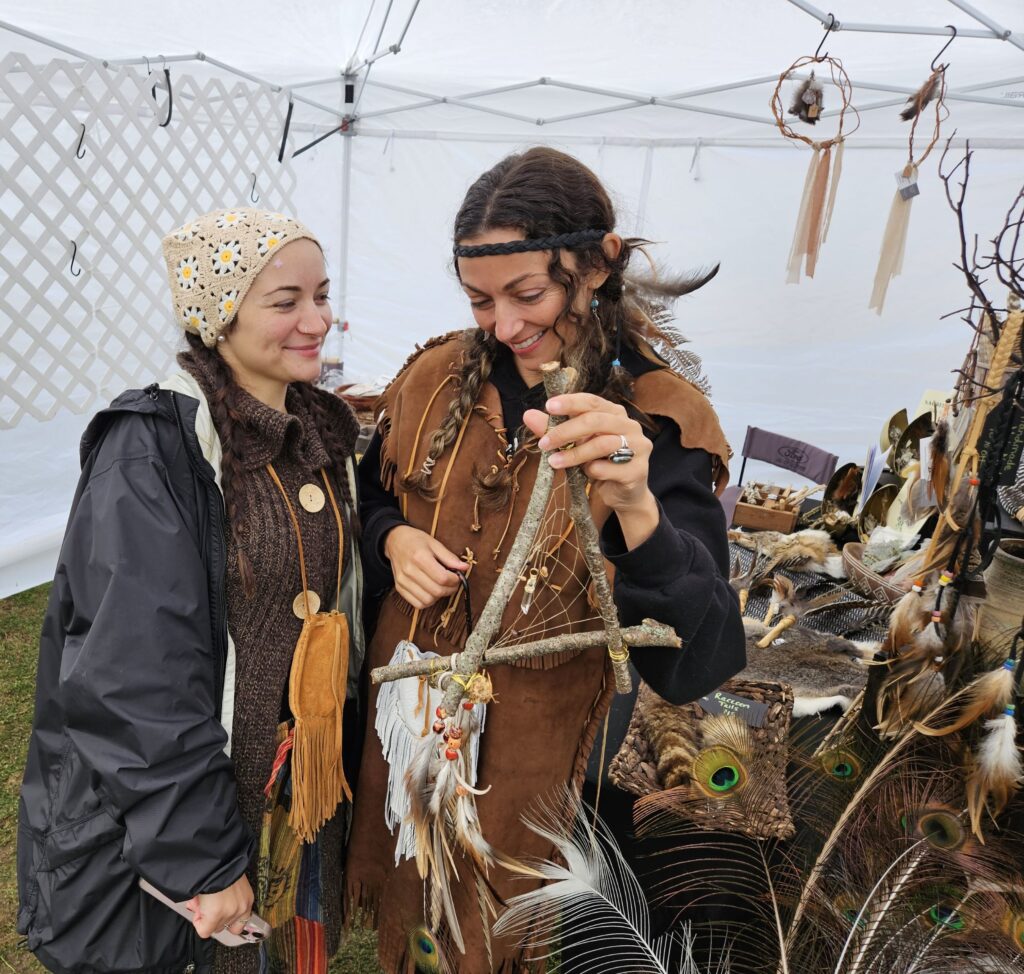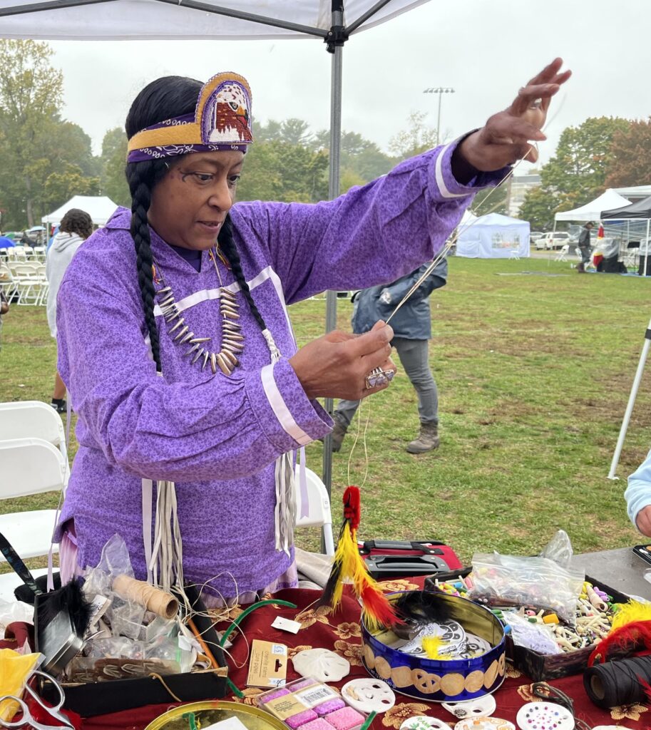 Under a canopy to keep materials dry, children created their own necklaces in a craft tent run by Nancy “Daughter of the Redtail Hawk” Brown-Garcia, chief historical deputy of the Narragansett Tribe. The Rhode Island resident began a necklace for a local child by hanging feathers from pipe cleaners and letting her add beads to make her own colorful piece of jewelry.