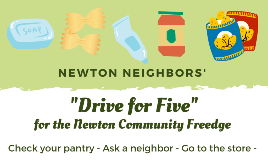 Newton Neighbors is hosting a Drive for Five for the Newton Community Freedge. They are looking for donations of the following items: The items can be dropped off on Sunday, October 20, 11AM-4PM at the Newton Harvest Fair.