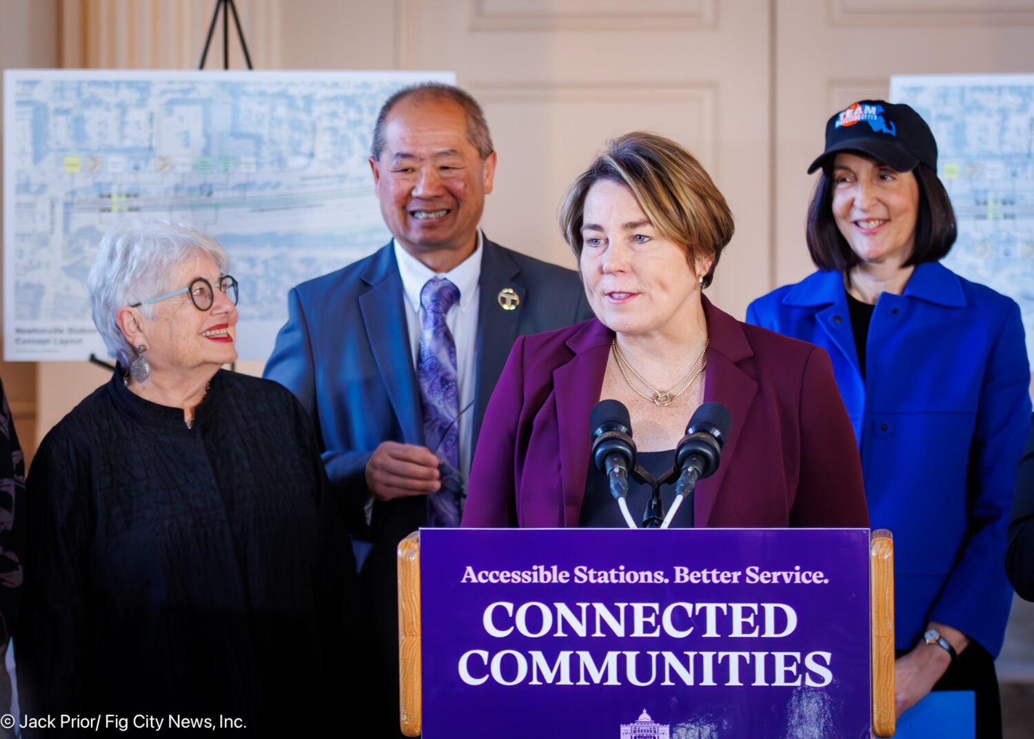 At a large, enthusiastic gathering on November 25 in Newton’s War Memorial Auditorium, Governor Maura Healey announced that the Newtonville Commuter Rail station, on the Framingham / Worcester Commuter line, is now slated for an upgrade that will make it fully accessible and able to handle bidirectional rail traffic.