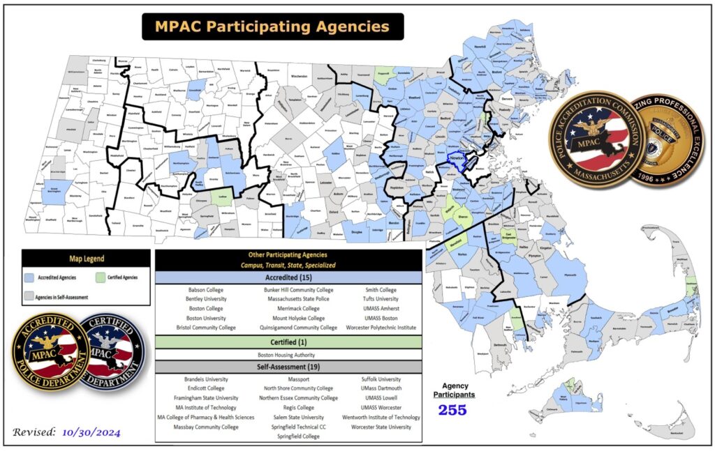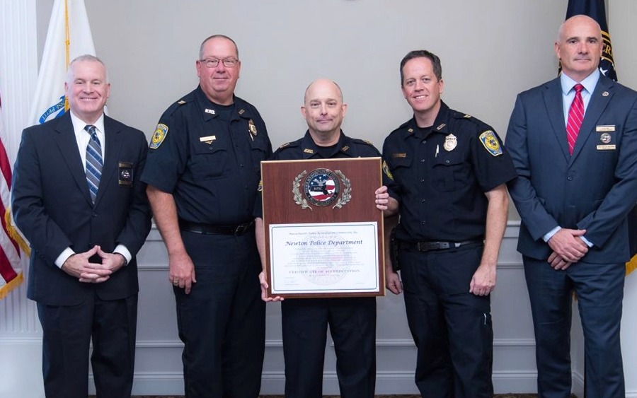 After two years of working toward the goal, the Newton Police Department (NPD) received full accreditation by the Massachusetts Police Accreditation Commission (MPAC) on October 30. NPD Acting Chief George McMains accepted the award at a ceremony that day.