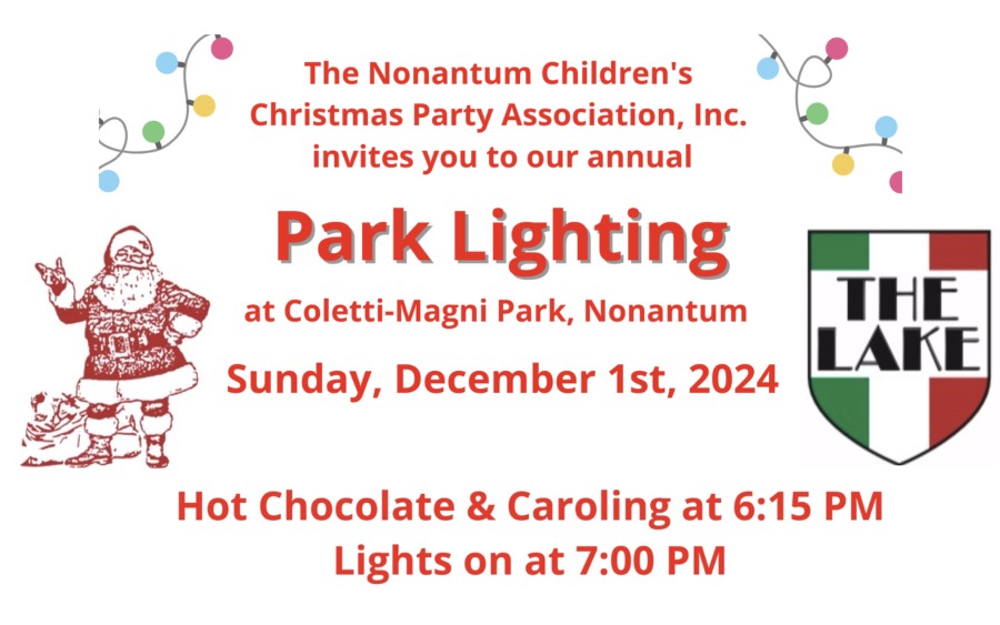 Nonantum Children’s Christmas Party Association will host the annual Nonantum Park Lighting at Coletti-Magni Park (391 Watertown Street, Nonantum) on December 1. Hot chocolate and caroling will begin at 6:15PM. Santa will arrive with friends from the North Pole and be available for photos just after the lights go on…