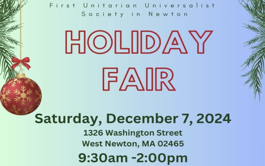 The First Unitarian Universalist Society in Newton (FUUSN) will hold its annual Holiday Fair on Saturday, December 7, 9:30AM-2PM at FUUSN (1326 Washington Street, West Newton). There will be decorated wreaths, jewelry, handmade and regular gifts, toys, homemade baked goods, and books. Also a quilt raffle, and FUUSN’s Silent Auction…