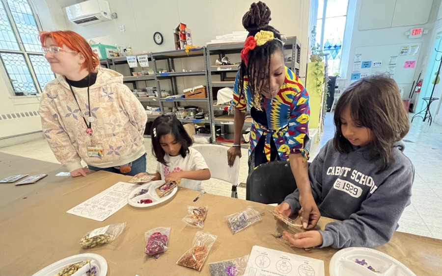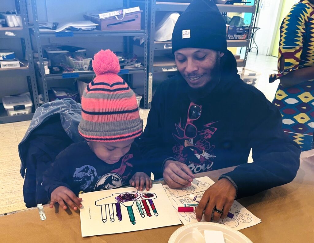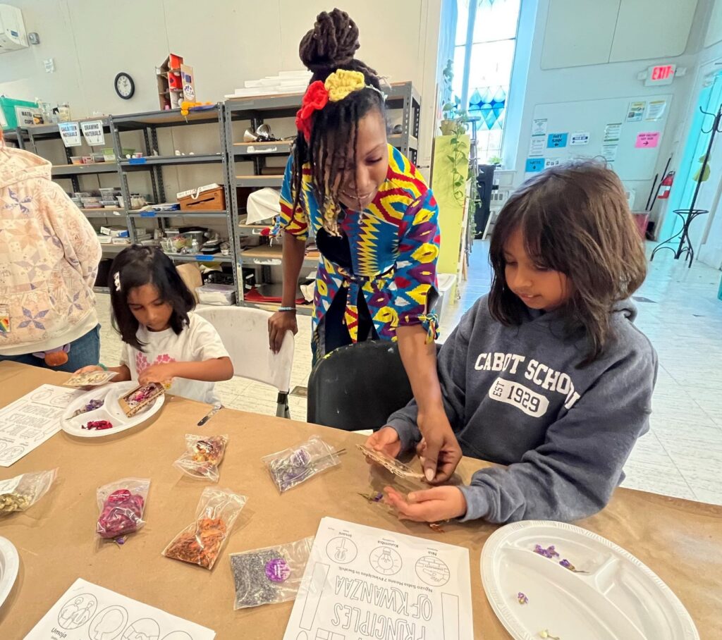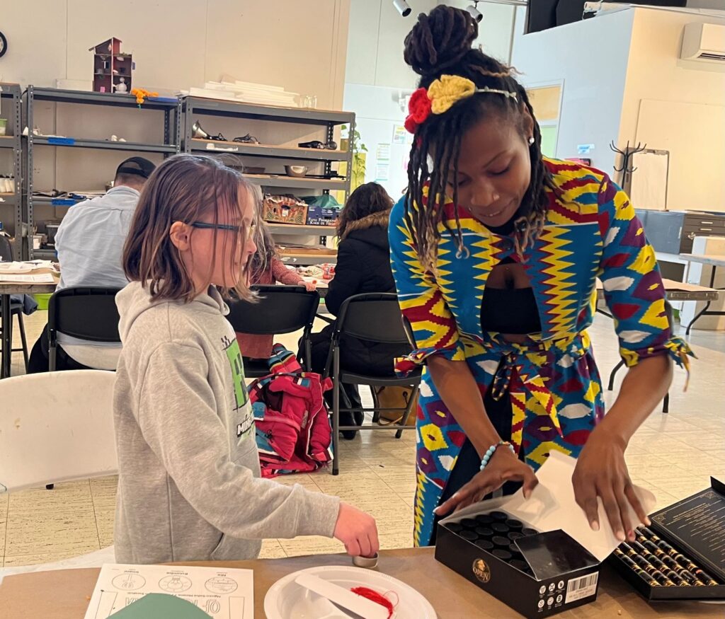 In one room, Brown set up an impressive seven activities since she said gifts are given on each of the seven days of Kwanzaa. Kids – and their parents – created suncatchers with dried herbs and flowers; picked their own scents and colors for individual candles; decorated cards; designed bookmarks; strung beaded bracelets; sculpted with clay; and/or colored in their own kinara or candleholder used during the holiday.