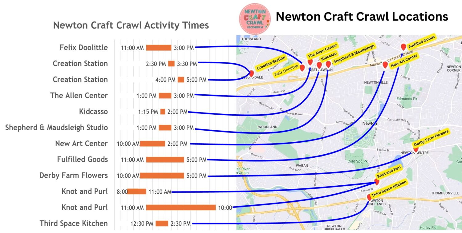 All Over Newton’s Craft Crawl Guide provides descriptions of each activity, addresses of the shops, links to websites, a schedule, and a map. We’ve tied the schedule and map together here to help you find opportunities wherever and whenever you find yourself while shopping locally this Saturday.