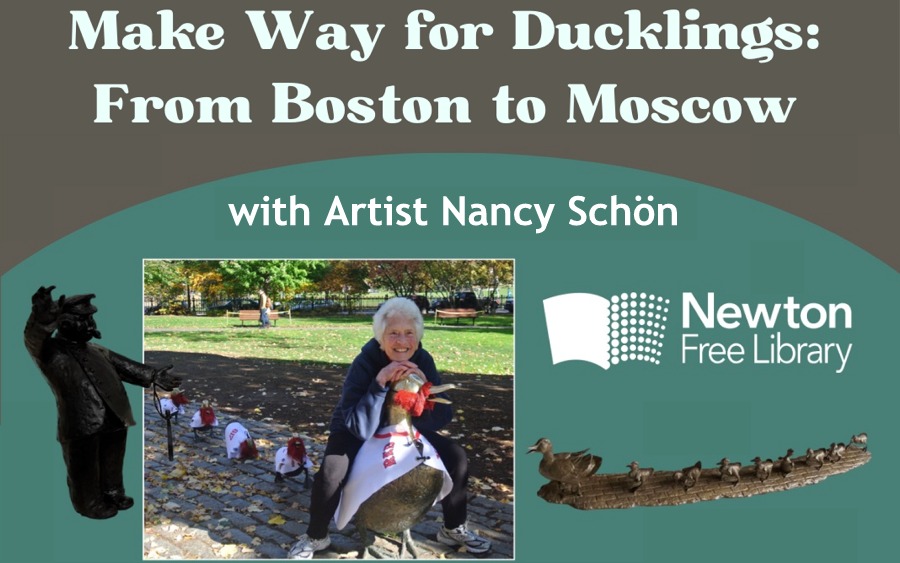The Make Way for Ducklings sculpture in the Boston Public Garden is a beloved, iconic piece of public art, created by Newton artist Nancy Schön. On Sunday, January 26 at 2PM, the Newton Free Library, will host a screening of the documentary Make Way for Ducklings: From Boston to Moscow with Nancy Schön, film producer Stella Gould, and photographer/editor Gino Mauro. The film explores the history of the sculpture, as well as the international effort to bring a second set of Make Way for Ducklings statues to Moscow in 1991. A Q&A with Nancy Schön will follow the screening. This program is for adults.
