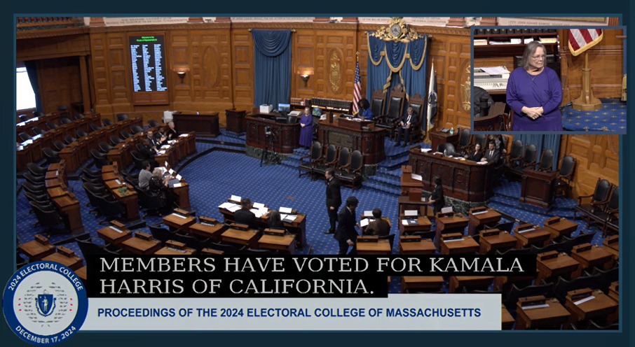 Sharon Stout was one of the eleven electors of Massachusetts who convened at the State House on Tuesday, December 17, to cast ballots for President and Vice President of the U.S. in the 2024 election. That day, she was elected president of Electoral College and presided over the event, in which all eleven electors voted for the Harris/Walz ticket. Ms Stout is Chair of the Newton Democratic City Committee and a Deputy Treasurer of the Massachusetts State Democratic Party. See texts of her nomination and remarks.