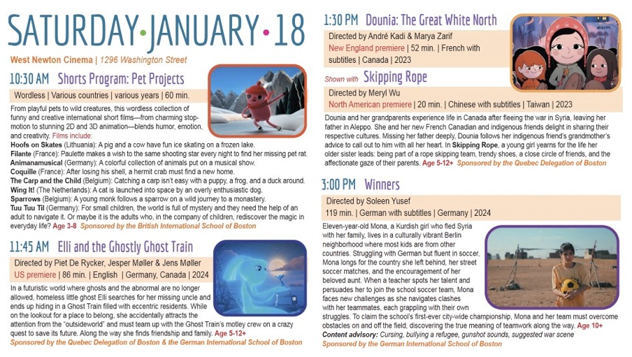 Belmont World Film’s 22nd Family Festival will present films for ages 3-12 in Newton, Arlington, and Cambridge over January 18-20 — kicking off at the West Newton Cinema (1296 Washington Street, West Newton) on January 18 for a day of films for kids: