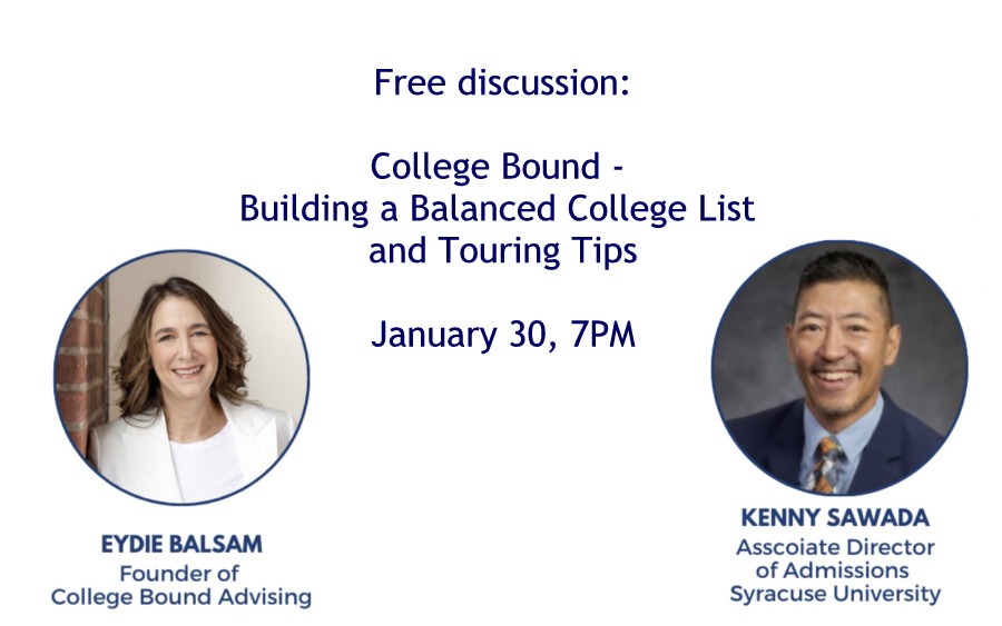 College Bound Advising will host a free information session, College Bound – Building a Balanced College List and Touring Tips! on Thursday, January 30 at 7PM. CBA staff and Kenny Sawada, Associate Director of Admissions at Syracuse University, will discuss how high school students can successfully build their college lists and make…