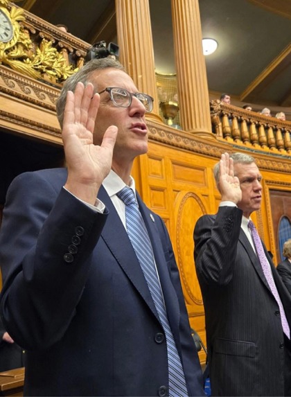 Amy Mah Sangiolo (11th Middlesex District) and Greg Schwartz (12th Middlesex District) were among nineteen new House legislators taking the oath of office at the State House on Wednesday, January 1, 2025. Governor Maura Healey administered the oath, after thanking members for their commitment to serve the Commonwealth. “It’s not easy to put yourself out there to run,” she said, adding “It’s not easy to do the work once you are elected.”